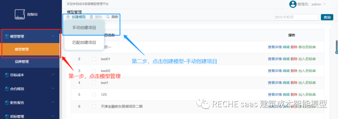 ① 进入成本数据模型管理平台后,点击【模型管理】→【创建模型】→【手动创建项目】,如图2-6所示: