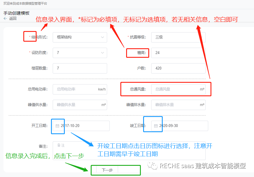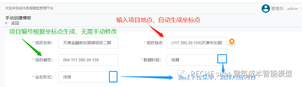 ② 进入手动创建模板后,根据对话框提示分别录入实际项目情况,注意“项目名称”命名规则为“1地区+2业主简称+3项目全称+4分期(例如:天津金融街东丽湖项目二期)”,具体如图2-7: