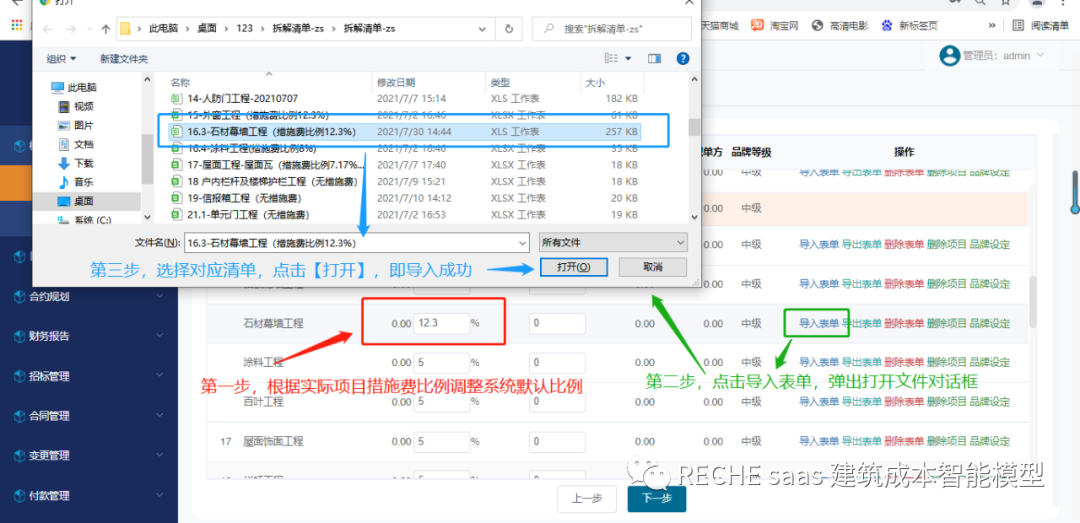 ③项目信息录入完成后,点击下一步,进入分部清单管理界面,此界面呈现内容包含图2-1所示全部章节清单。此时需将准备好的标准模板清单通过【导入表单】导入系统,注意当前界面措施费比例为默认值,需根据实际项目比例手动修改,如图2-8(以石材幕墙工程为例):