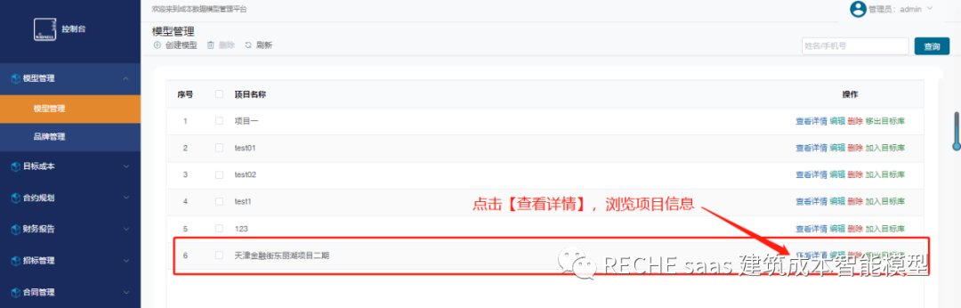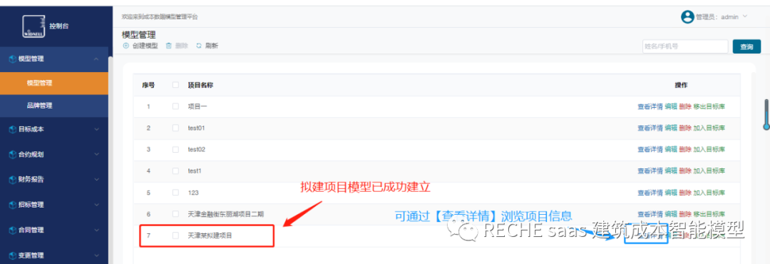 ⑥点击【生成项目】后即返回模型管理主界面,此时整项工程已成功录入软件系统,可通过【查看详情】浏览项目信息,如图2-11: