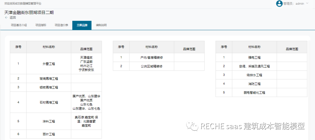 √主要品牌,系统根据导入表单内容将本项目材料选型品牌集中呈现;