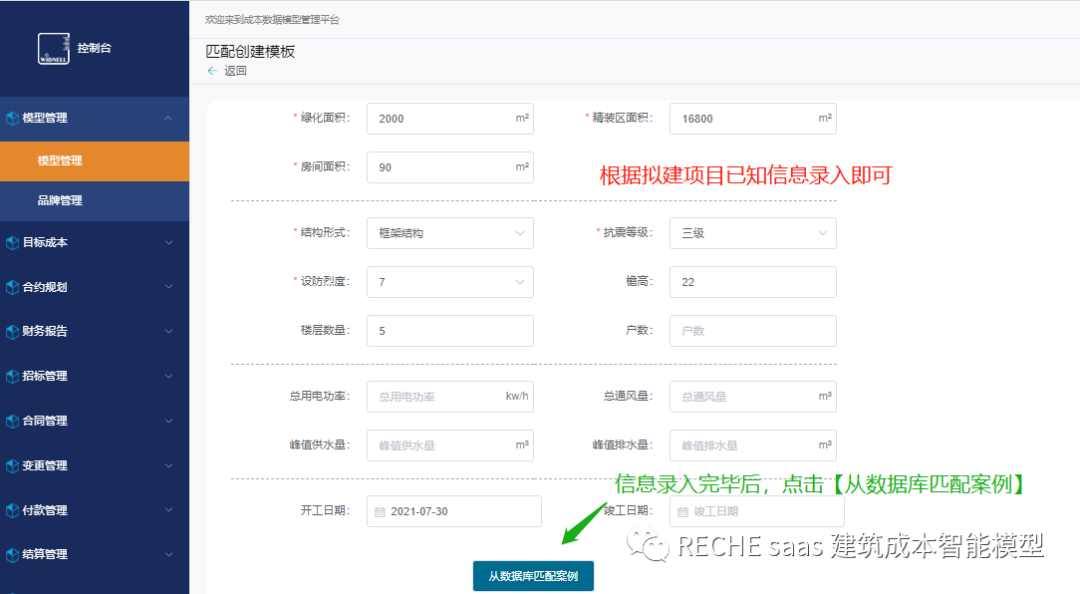 匹配创建项目,即按拟建项目信息参数自动搜索数据库内相似案例,并通过系统内置规则,自动计算并生成拟建项目成本数据。