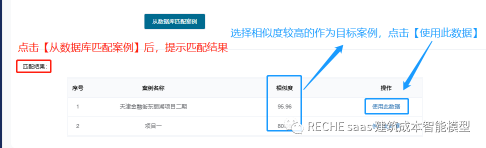 ③ 拟建项目信息录入完毕后,点击页面下方【从数据库匹配案例】,系统将提示出“匹配结果”,则可选择相似度较高的案例作为目标案例,点击【使用此数据】,如图3-3: