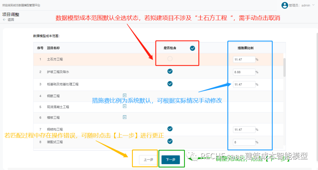 ④ 点击【使用此数据】后,进入“项目(成本范围)调整”界面,此时需根据拟建项目要求选择数据模型成本范围(如是否包含土石方工程)以及调整措施费比例,完成后点击【下一步】,如图3-4: