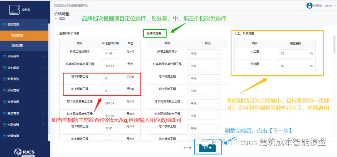 ⑥ 点击【下一步】后进入“价格调整”界面,包括“主要材料价格”、“品牌限定表”、“人工机械调整”三个板块;可根据拟建项目项目地点、项目规模、项目定位、开发周期有针对性的调整人材机价格水平及材料档次,调整界面如图3-6,完成后点击【下一步】: