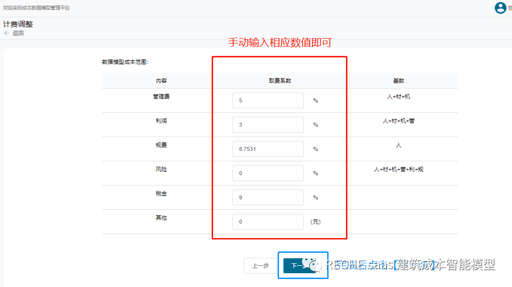 ⑦ 点击【下一步】后进入“计费调整”界面,可根据拟建项目要求有针对性的调整管理费、利润、规费、风险、税金、其他等取费系数(其中取费基数为系统默认,不可修改),调整界面如图3-7,完成后点击【下一步】: