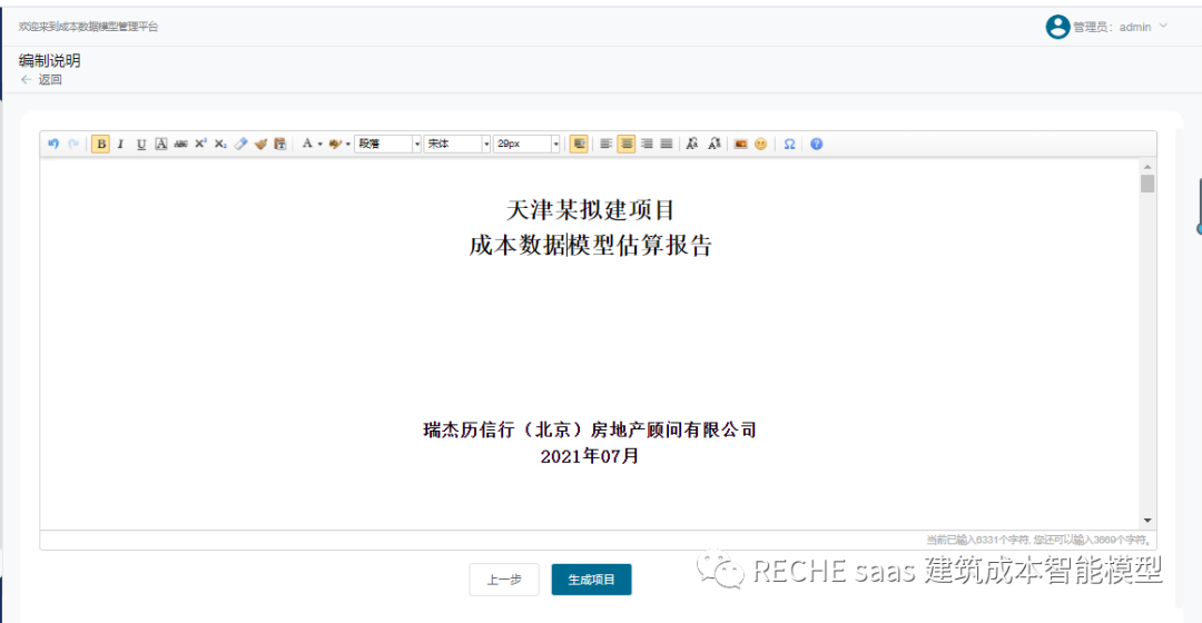 ⑨ 点击【下一步】后进入“编制说明”界面,可手动编辑拟建项目成本数据模型估算报告,形式不限,完成后点击【生成项目】,如图3-9: